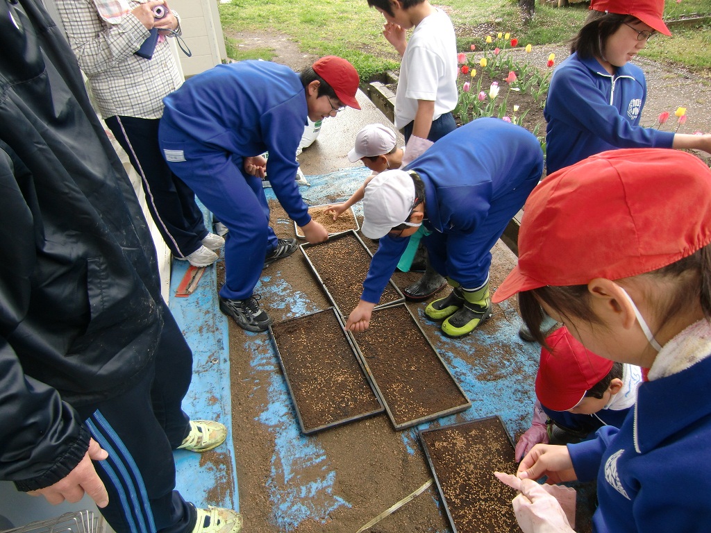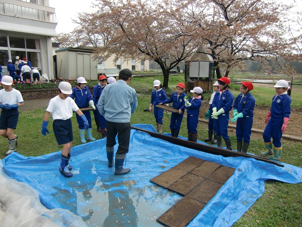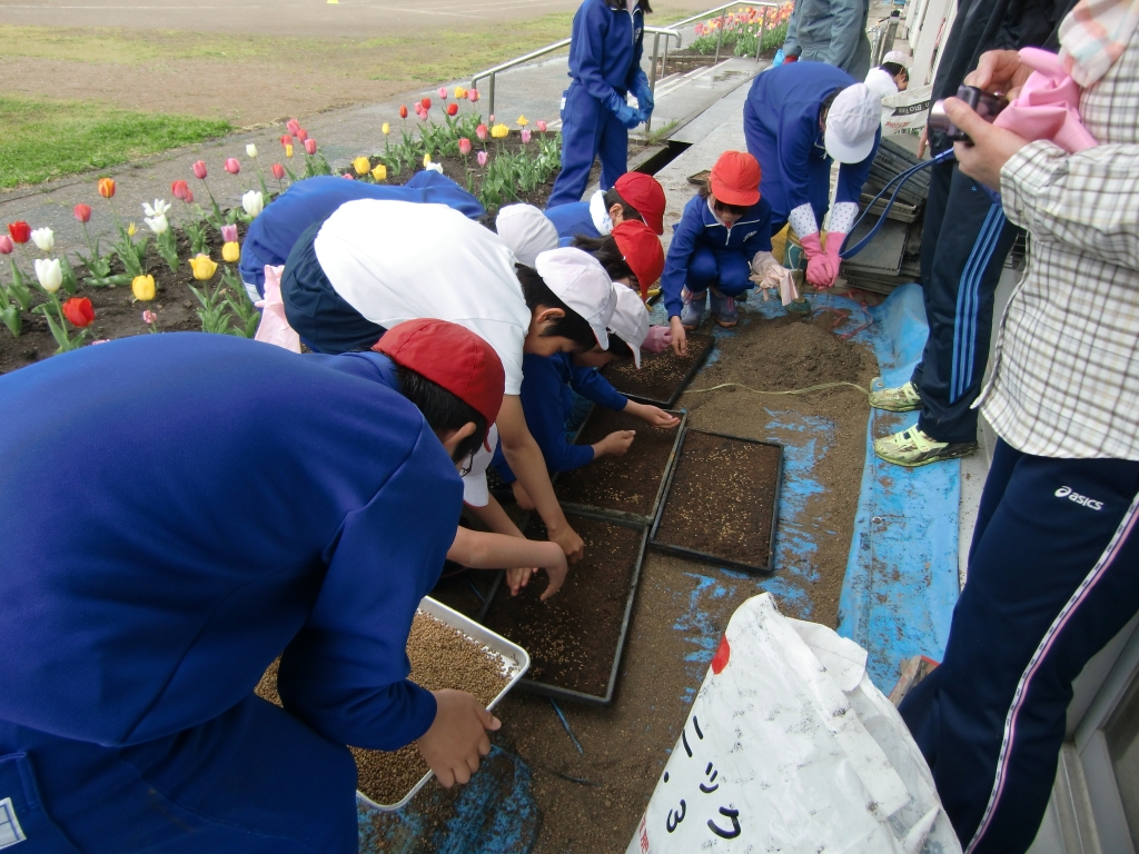 今日から、5,6年生による「喜多方一おいしいお米作りプロジェクト」がスタートしました。農業支援員の方からご挨拶をいただいた後、苗箱の中に土を入れ種籾(こがねもち)を蒔きました。校庭に準備した苗床に綺麗に並べて発芽を待ちます。田植えは、6月上旬になる予定です。今年も加納小フェスティバルのおいしい餅になったり、一人暮らしのお年寄りへの赤飯になったりする大切な餅米となることでしょう。