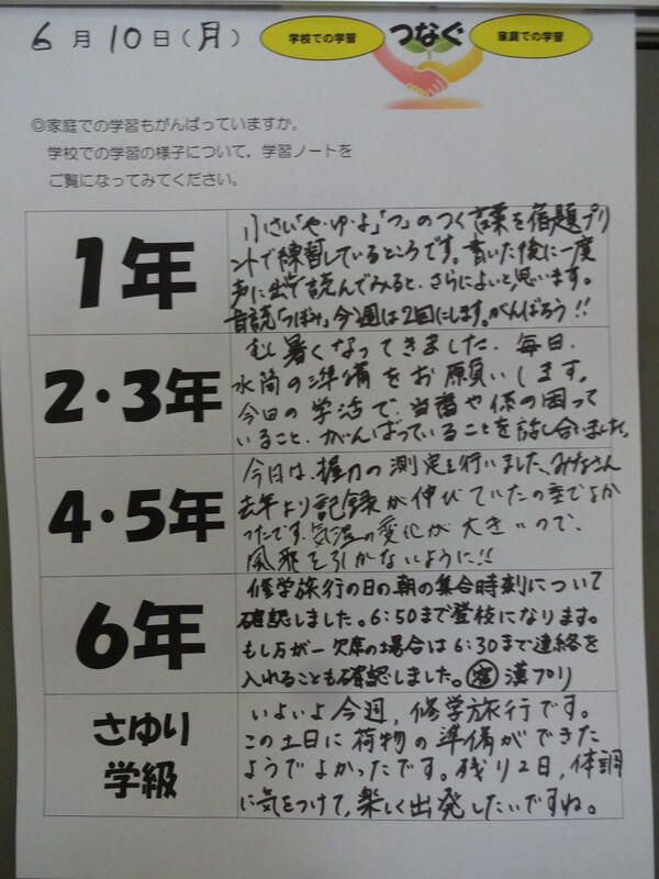 いよいよ明日から、6年生の修学旅行です。天候にも恵まれそうなので、すてきな思い出が、きっとできることでしょう!