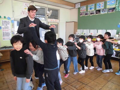 ALTの先生と一緒に体をいっぱい動かしながら英語の歌を歌いました。