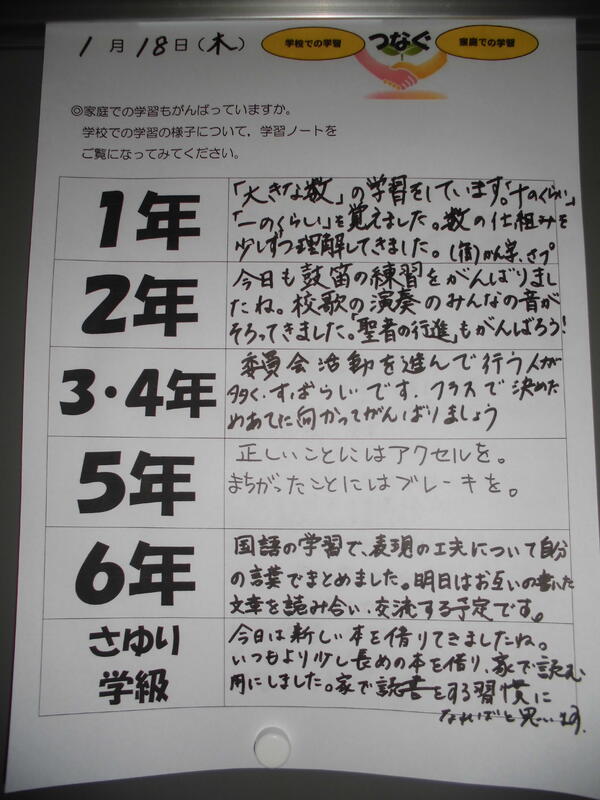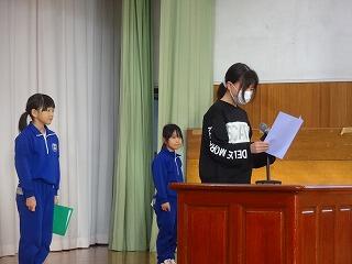 本日の全校朝の会では、3学期のめあての発表がありました。学年のまとめの3学期。めあてを設定し、その達成をめざして充実した学校生活を送ってほしいです。