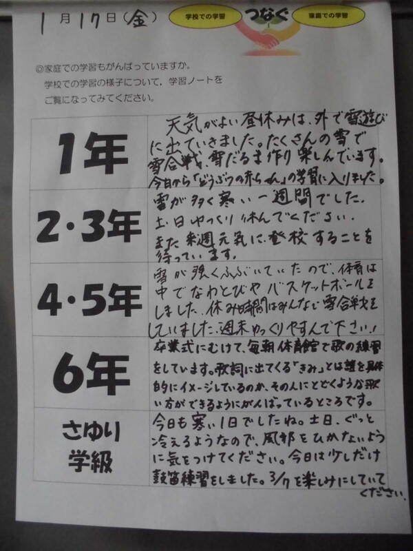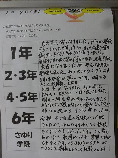 明日の登校時も大量の降雪が予想されます。安全を第一に考えて、あせらず、あわてずに登校させていただくようお願いいたします。