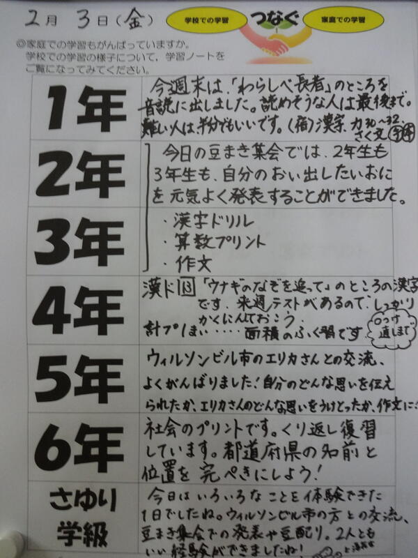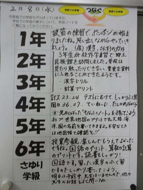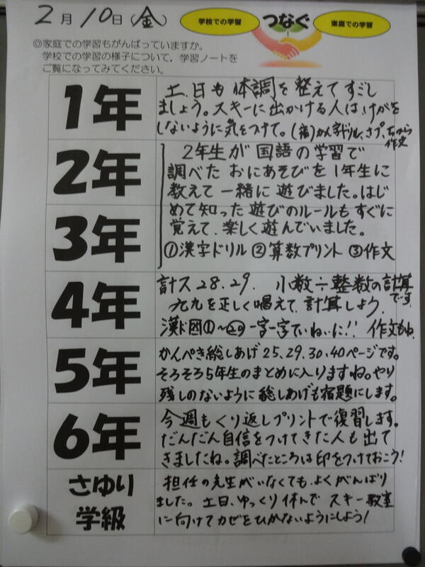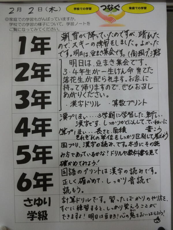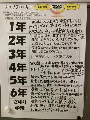 2023年2月13日 16時05分いよいよ明日は待ちに待ったスキー教室です。これまでの練習の成果を十分に発揮し、充実したスキー教室となるように、今日は早めに就寝することをおすすめします。