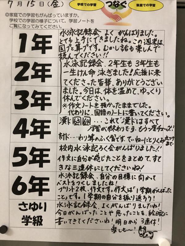 また、本日の4校時は、高水温のため水泳学習が中止となりました。本校では、子どもたちの安全を第一に考えて、基準にそって水泳学習の実施判断をしております。明日こそ、プールに子どもたちの声が響きわたりますように!