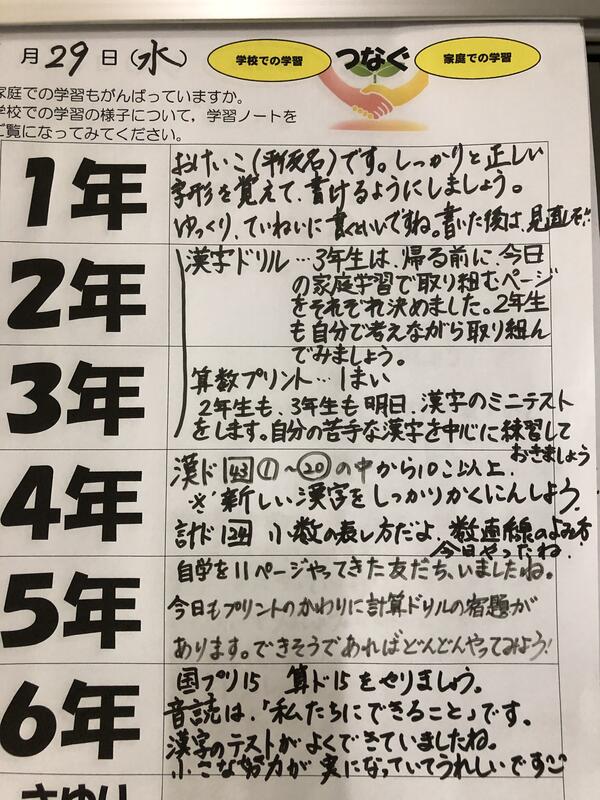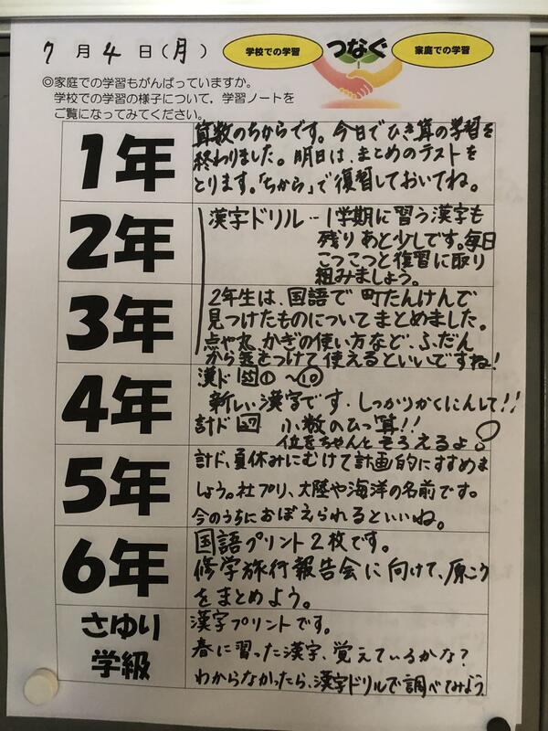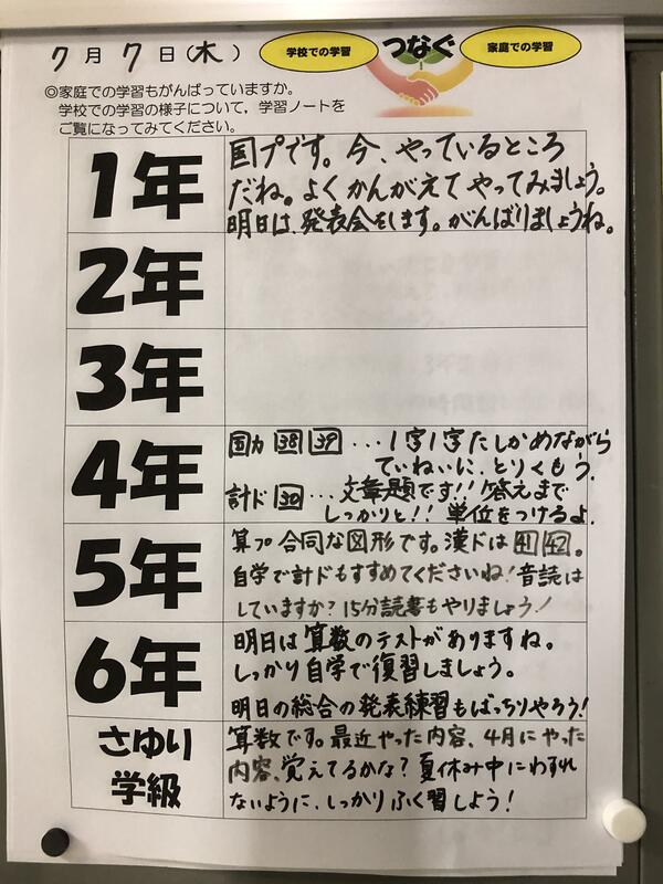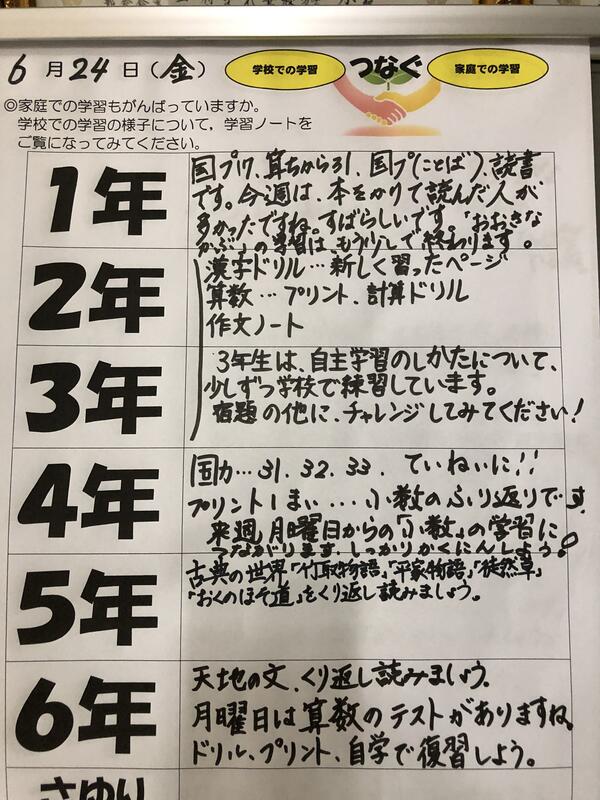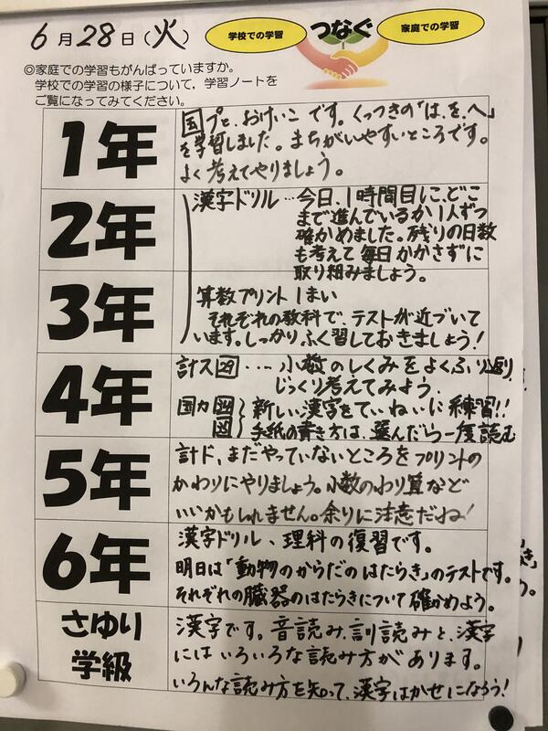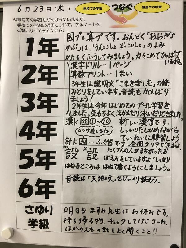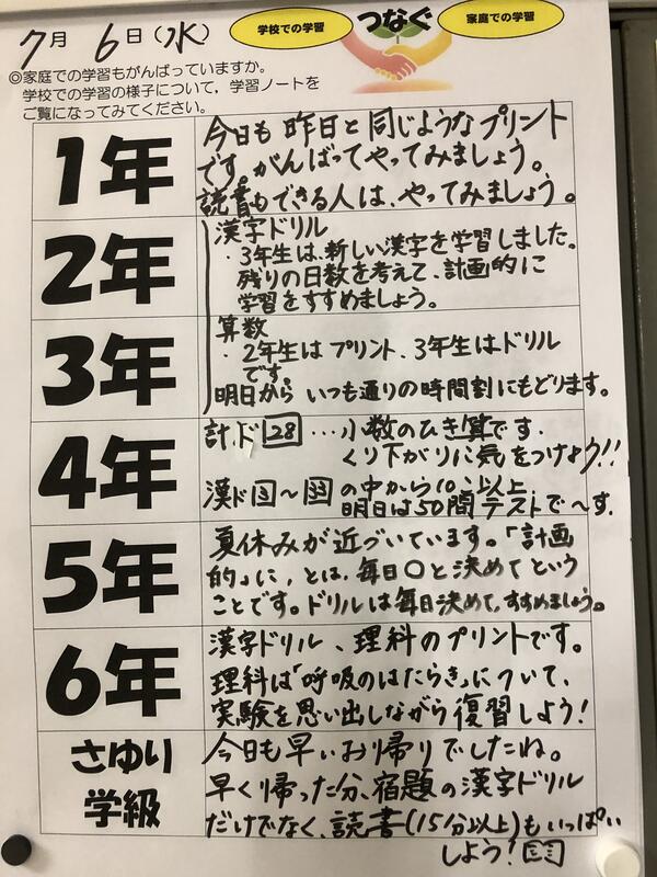 お家での学習について確かめてみてください。早めに学習を終えて、早めに寝て、暑さに負けないようにお願いします。