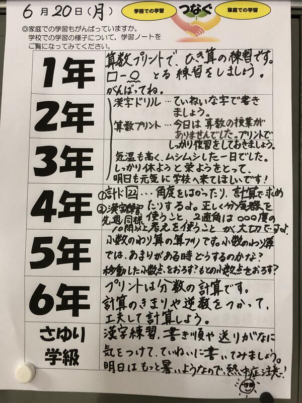 2022年6月20日 18時15分今日は朝からむし暑い一日でした。体調をくずさないように注意が必要です。学校では、衣服の調整や水分補給の声かけをいつも以上に行いました。