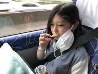バスの中は、甘い、しょっぱい、香りが漂っています。児童は、一人ずつ座っているので、できたお菓子タイムです。静かに味わっています!
