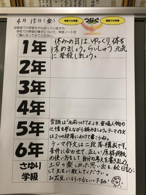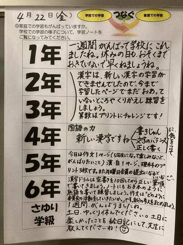 一年生も、全校のみなさんも、今週は寒暖差が激しく、疲れも出やすいかと思います。ゆっくり休んで、また元気いっぱいに月曜日に登校できるといいですね。