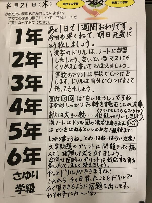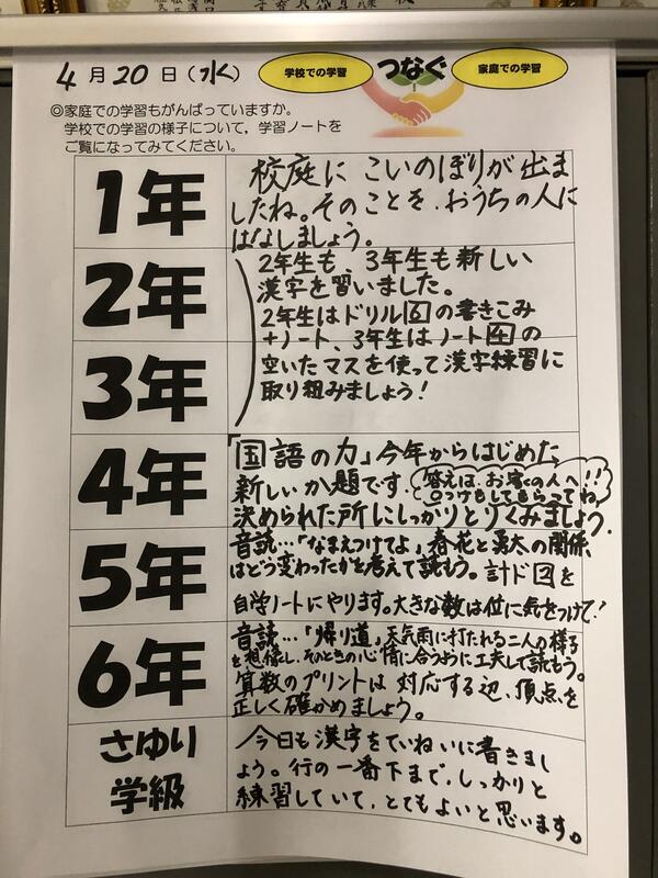 教科等の学びが進み、新しい学習内容に意欲的に取り組む姿が見られています。しかし、いろいろな面で、疲れが表れ始めるのもこの時期です。週末、お子さんとふれあっていただき、学校の話を聞いたり、励ましの言葉をかけていただけたりいただけたら幸いです。