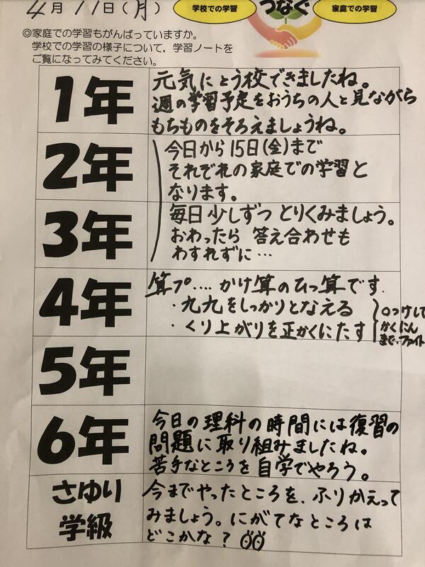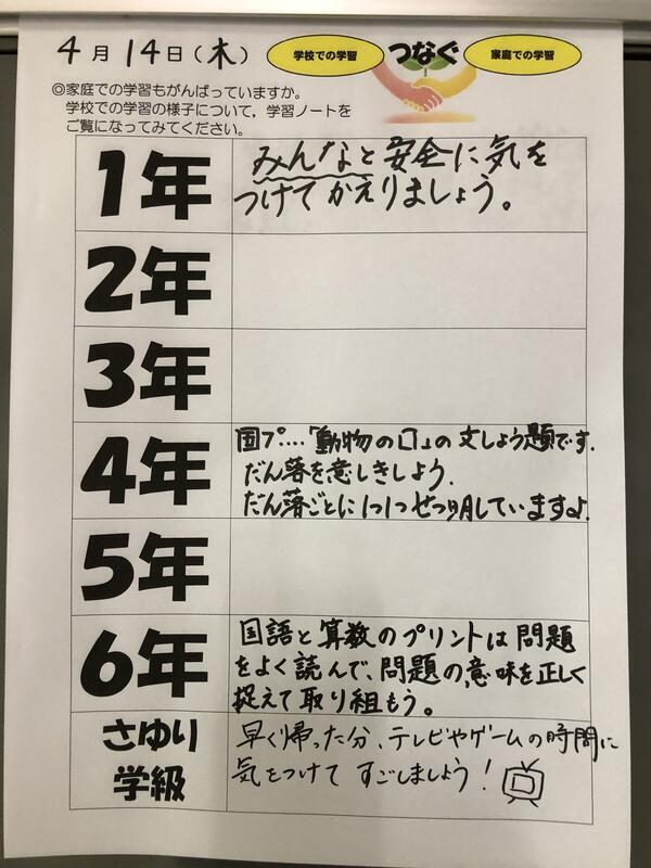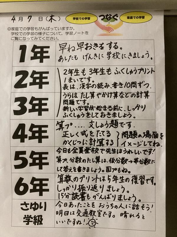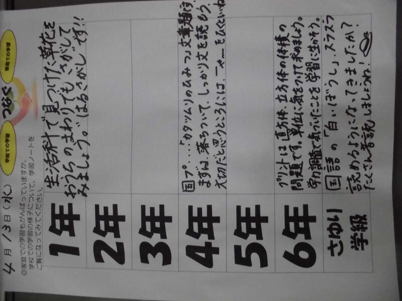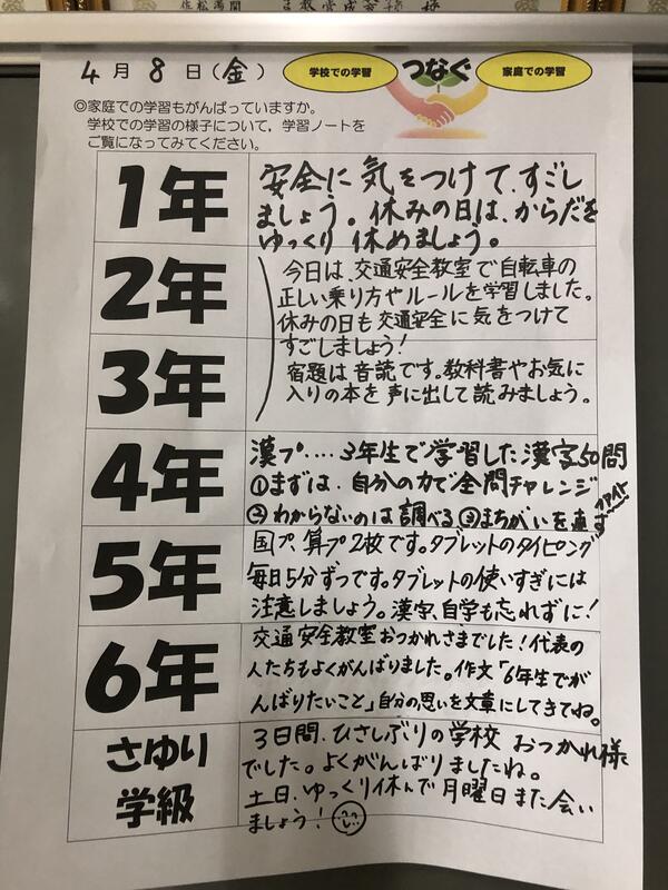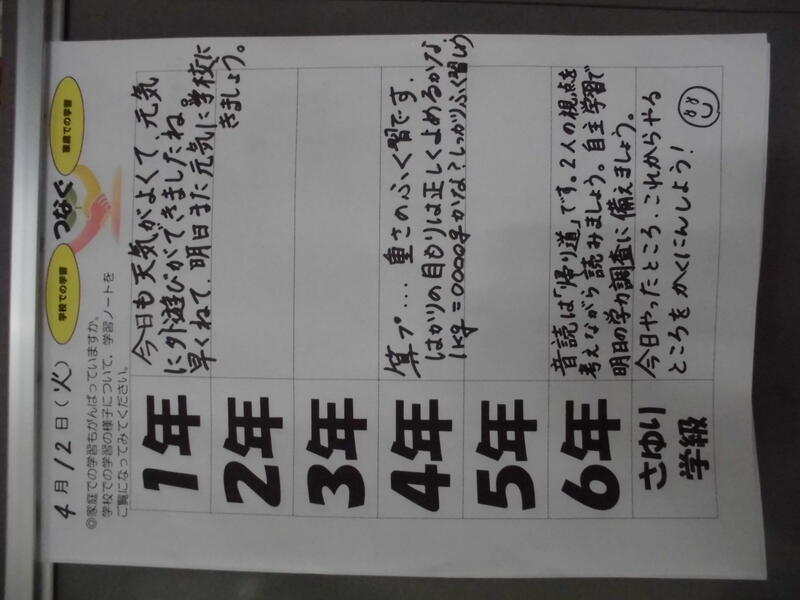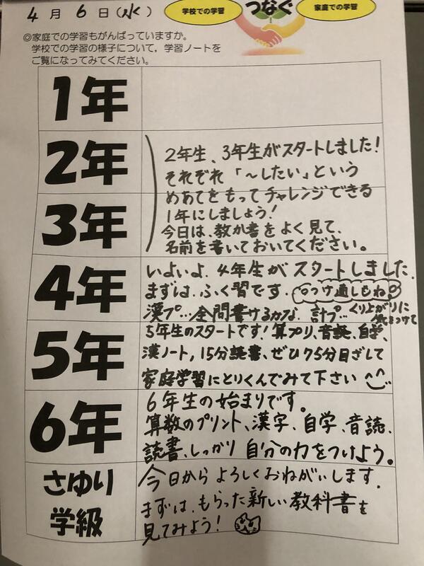 本日、子どもたちから提出された家庭学習からは、『今年はがんばるぞ!』という意欲の高まりがうかがえるものがたくさんありました。学校での学びと、家庭での学びが相互に関わり合うことで、確かな学力が育まれていくものと考えております。それぞれのお子さんの家庭学習の頑張りを認めることで、さらなる意欲の向上や学習内容の充実につながるよう、今後とも働きかけてまいります。