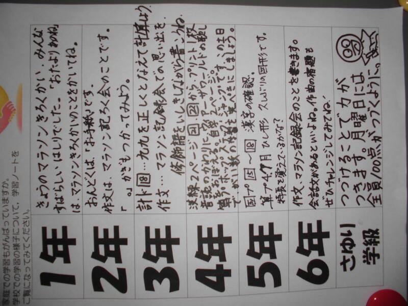 今日のマラソン記録会にむけて,がんばってほしいと話したことばです。今日は,マラソン記録会の様子を話題にしていただけたらと思います。どのようなチャレンジだったのか,話すことができるとよいと思います。