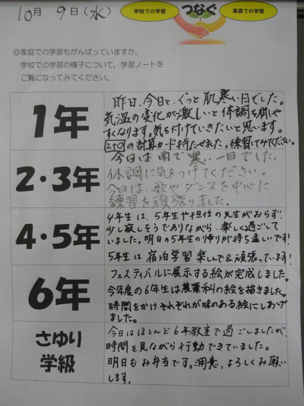 2024年10月9日 15時51分今日は5年生が宿泊学習で不在です。