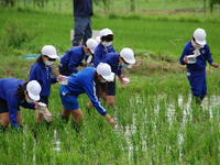 レクチャー後には水田へ向かい、実際に水生生物調査と除草を行いました。