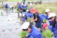 2015年6月5日 10時17分 6月4日、ぐずついた天気の合間をぬって「田植え」を行いました。5,6年生25人が待っていましたとばかり、ワイワイ言いながら楽し