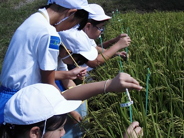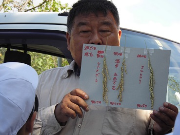 2015年9月1日 08時33分 8月28日(金),イネの観察を行いました。まず,山健さんからいろいろなイネの穂の付き方の違いを教えていただきました。