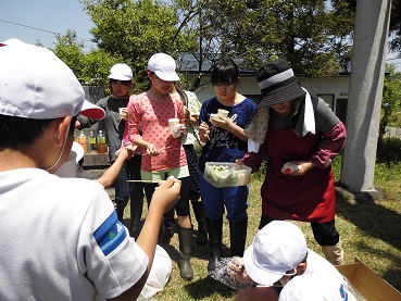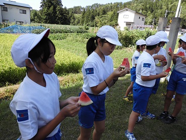 観察後,山健さんの畑で採れたスイカをごちそうになりました。