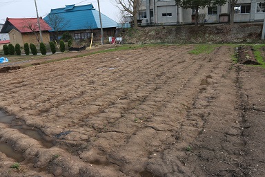 3月10日(火)~11(水)に降った春先の大雪のため学校裏の畑は未だに土が乾かず,4月中旬にも関わらず,あちこちに水たまりが見られる状態です。