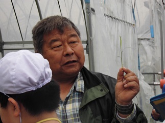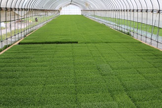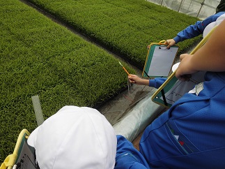 5月12日(火),山健さんのところへ苗の観察に出かけました。4月23日(木)にまいた種モミが,プール育苗という方法で育てられ,約15cmに成長していました。また,育苗ハウスには,芝生のようにきれいに生えそろったイネの苗が並んでいました。