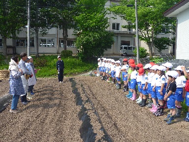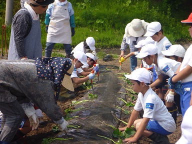 5月28日(木)の1校時,支援員さんや子どもたちのおじいさんやおばあさんに手伝っていただいて,サツマイモの苗を植えました。植え方を教わったり手直しをしていただいたりして,100本の苗を無事植えることができました。