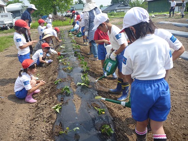 植え付けが終わった後,2年生を中心にじょうろで水やりもしました。