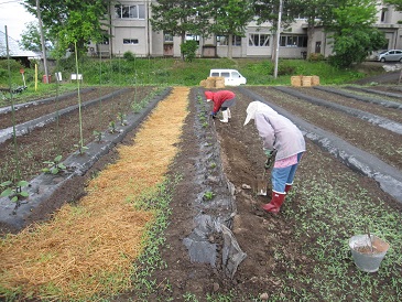 ついでに,サマースクールで食べる夏野菜カレー用のトマトとナスの苗の植え付けも行いました。昨年10月31日(金)に植えた夏野菜カレー用のタマネギはまったく育たず,使えるかどうか分かりません。今年は,どこでもタマネギのできがよくなかったと支援員さんが話していました。(何とかたべられるぐらいに成長したら写真を掲載します。)