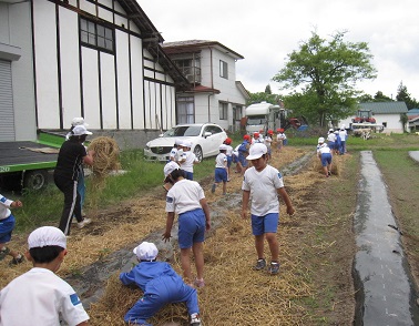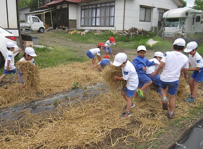 15分かかって何とか藁を敷き終えたました。その後,2年生に「なぜ藁を敷くの?」と聞くと,速攻で「草が生えないようにするため」「畑が雑草だらけにならないように」という答えが帰ってきました。