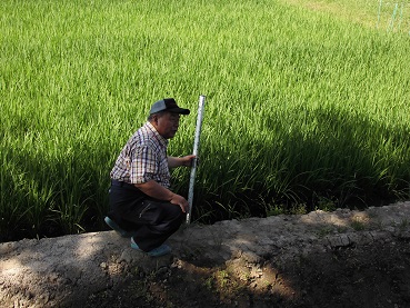 これからイネの成長を観察するために,自分の苗を決め,その横に棒を立て,成長の様子を記録することにしました。イネの苗は約23cmに成長していました。