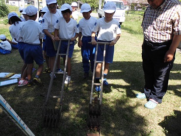 今年は,ころばしを使った草取りや稲刈りの際の棒がけによる天日干し,足踏み脱穀機を使った脱穀など,支援員のみなさんがいろいろ考えてくださっています。