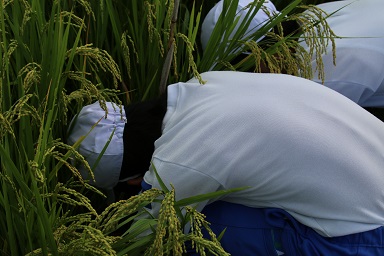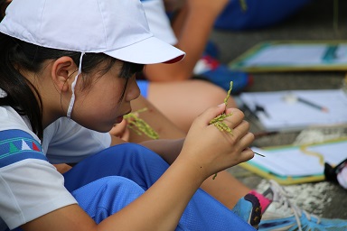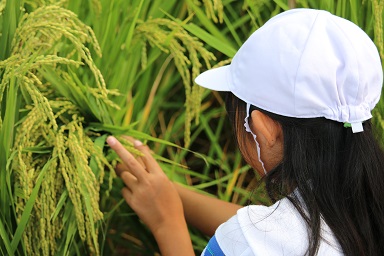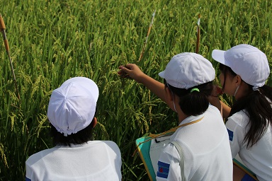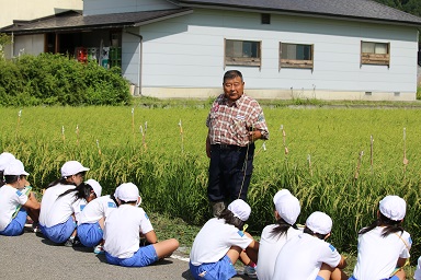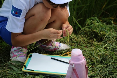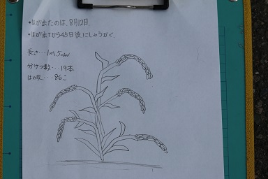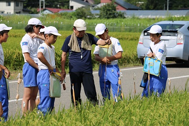 2014年9月2日 13時50分 9月2日(火)1校時,5・年生がいつものように山健さんの指導を受けながらイネの観察を行いました。