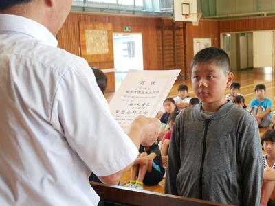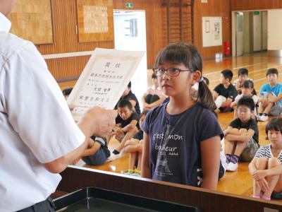 始業式では、校長先生から、①「めあてをもってこつこつがんばること」②「いろいろなことにチャレンジすること」③「楽しい学校生活を創ること」のお話があり、子どもたちは真剣に聞いていました。また、式の後には、夏休み中に行われた市民水泳大会で50m平泳ぎと背泳ぎで2位となった4年佐々木秀虎さん、50m背泳ぎで3位となった5年大関智華さんに、また少年の主張大会で最優秀賞に輝いた6年大竹芽吹さん、それぞれ賞状が伝達されました。子どもたちの夏休み中の活躍をうれしく思います。