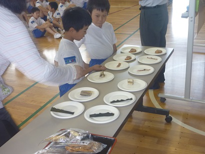 の大切さについてお話がありました。各学年の代表児童がせんべいやスルメ、棒
