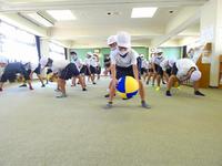 まず、体ほぐしとチームワークの向上目指して、ボール股くぐりリレー