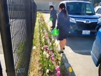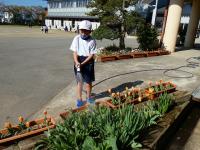 一方、児童会の環境委員は、今が盛りのチューリップに水やり中。