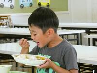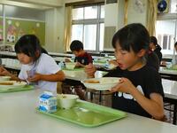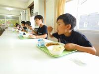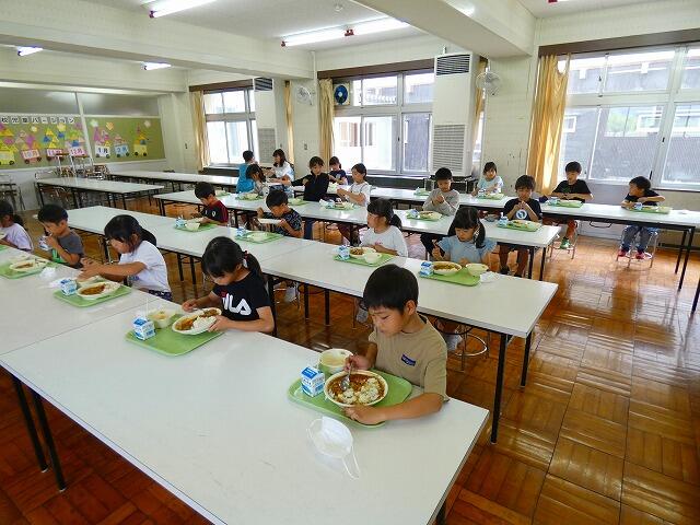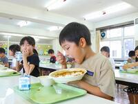 未だコロナ禍が続く中、感染症対策として、2学年ずつ、一方を向いての食事(黙食)としています。