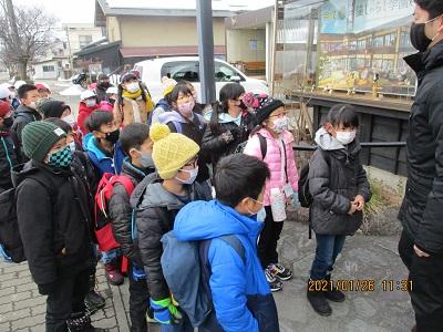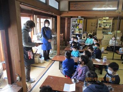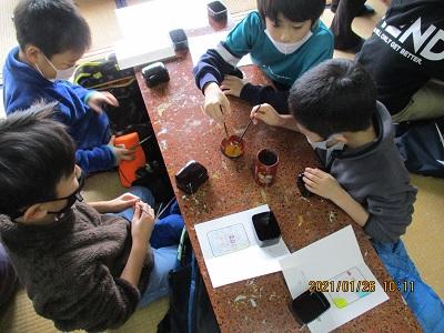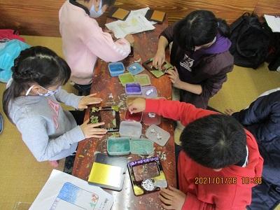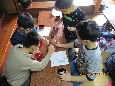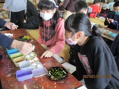 2021年1月26日 15時08分1月26日(火) 4年生が総合的な学習の時間を利用して、「喜多方の伝統工芸について調べよう」というテーマのもと、木之本漆器店さんを訪問しました。今日は、小物入れや小皿、写真立てなどに、絵付けの作業を体験させていただきました。体験を円滑に行うために、事前に絵の下書きをしておきました。それをもとに、筆を使って慎重に作業を進めました。筆以外にも、スポンジを使って色をつけたりもしました。自分の好きな絵を書く児童が多かったようですが、中には「努力」と書いた子や「疫病退散」という字とアマビエをセットで書いた子もいました。行きは少し遠い道のりでしたが、みんな頑張って歩きました。全員無事にいってくることができて良かったです。ぜひ、お家で活用してほしいなと思います。