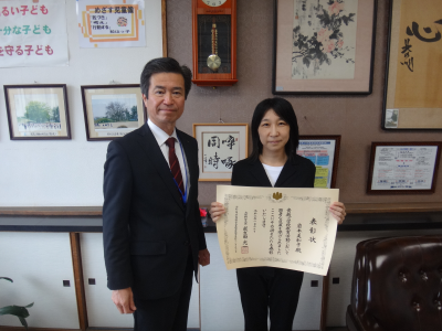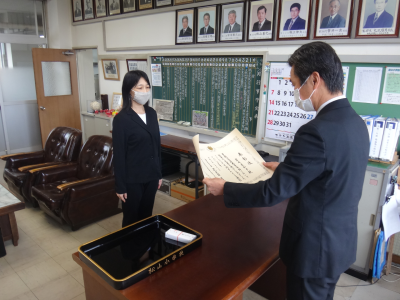 2021年3月2日 11時14分3月2日(火) 昨年度、本校職員岩本美和子教諭が、福島県の優秀教職員の表彰を受けました。さらに、文部科学大臣優秀教職員として、文部科学省からも表彰を受けました。表彰式は、例年東京都で開催されていましたが、今年度はコロナ禍ということで、表彰式が中止となってしまいました。今日は、その表彰にかかる物件伝達として、福島県教育庁会津教育事務所の横山所長と渡部次長が来校されました。横山所長より賞状を授与され、岩本教諭から一言感想が述べられました。本人はじめ、学校全体で、この快挙を喜びたいと思います。今後も、地域の方に支えていただきながら、私たち教職員一同、一生懸命教育活動に従事していきたいです。