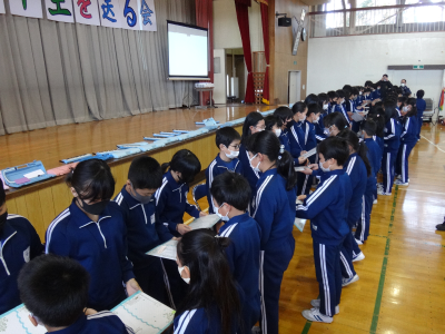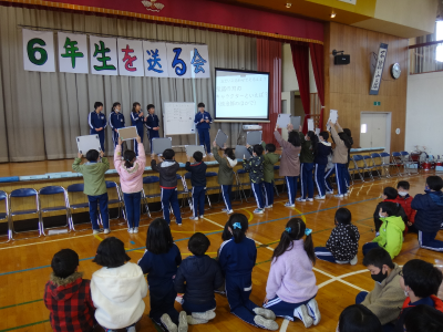 2021年3月4日 15時01分3月4日(木) 3・4校時に「6年生を送る会」を行いました。昨年度は、臨時休業等で実施できませんでしたが、今年度は密を避けながら行いました。会に先駆け、創立130周年記念について校長先生から話がありました。本来なら、記念式典を行い、これまでの本校の歩みについて考えながら祝うところですが、コロナ禍により式典が中止となってしまいました。記念品として作製したクリアファイルを代表の庄司さんに渡しました。本日、全員持ち帰りますので、お家でご覧ください。さて、送る会では、6年生と各学年がゲームを行い、楽しい時間を過ごしました。5年生が工夫を凝らしたゲームを用意してくれたので、6年生も満足した様子でした。後半は、鼓笛移杖式も行いました。在校生(3年生以上)は6年生を前に、堂々と演奏できました。また、6年生も感慨深く、在校生の姿を眺めていました。見ているこちらも、ジーンとくるものがありました。今まで学校の顔として常に先頭に立ってくれた6年生、そして、今日の会を一生懸命頑張ろうとする5年生、何だか良い引き継ぎができた感じがします。