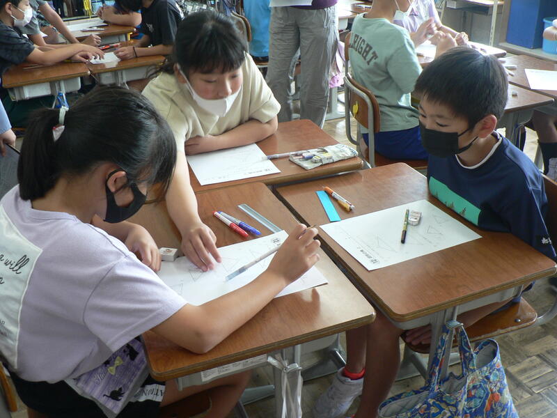 2022年9月2日 12時45分2校時に5年生の算数科の研究授業を行いました。「図形の角を調べよう」の単元で、今まで学習したことを活用して難しい問題に各グループで挑戦する学習でした。難問解決を目指して、自分の考えをまとめたり、友だちと考えを交流し合ったりしながら一生懸命学習する姿がたくさん見られました。難しい問題に、友だちと力を合わせてチャレンジする楽しさや気持ちよさを感じた5年生の皆さんでした。