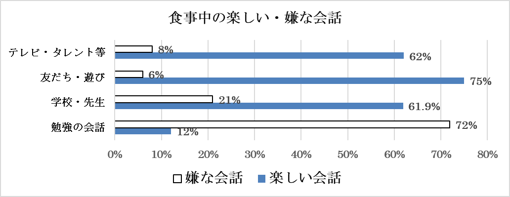 子どもにとって、勉強の話は“せめて食べるときくらいはお断り”のようです。それに対して、友だちや遊び、ゲーム、テレビのこと、学校のことをたくさん聴いてほしいのです。