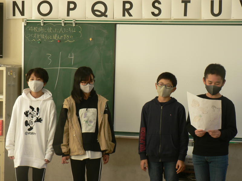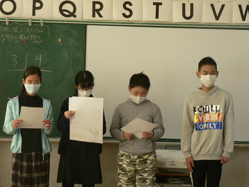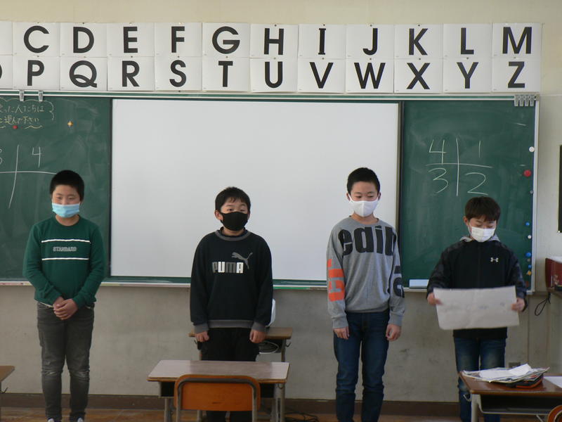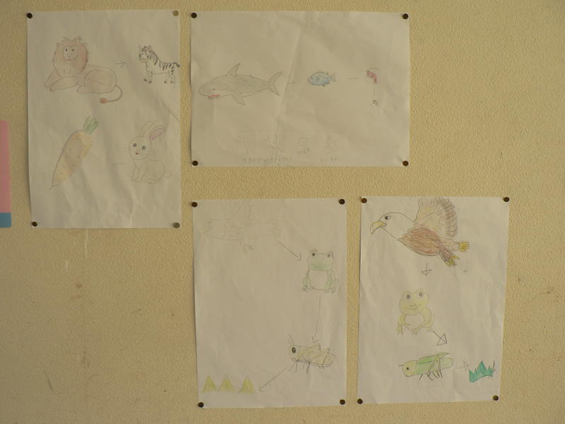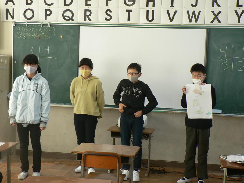 2020年11月4日 14時18分6年生の外国語科の授業の様子です。「地球に暮らす生き物について考え、そのつながりを発表しよう」というめあてに向かって学習しました。各グループに分かれて自然界の食物連鎖についてのポスターを作り、その説明を英語で行いました。「・・・live in the~~~(・・・は~~~に住んでいる)」「・・・eatーーー(・・・はーーーを食べる)」等の表現を使って行いました。グループで協力して準備、練習し、しっかり説明することができました。