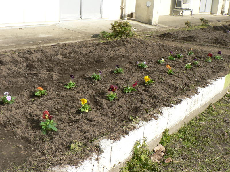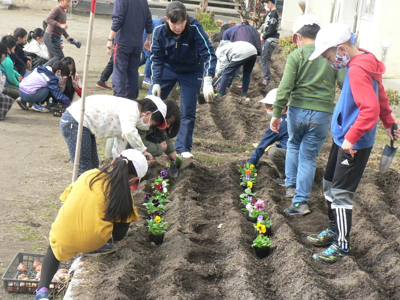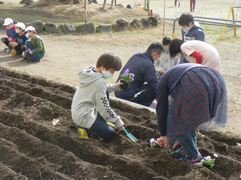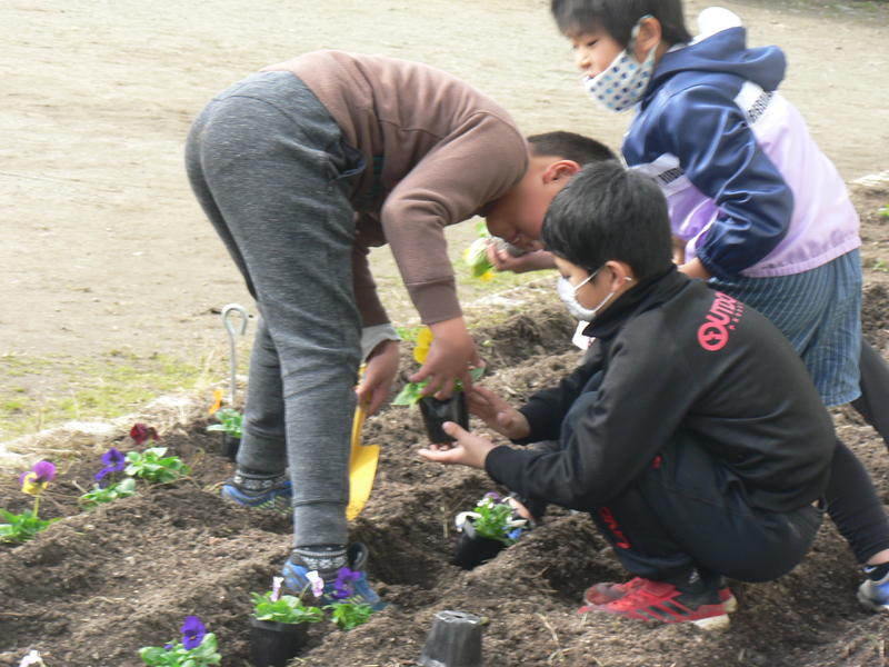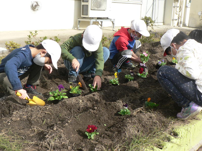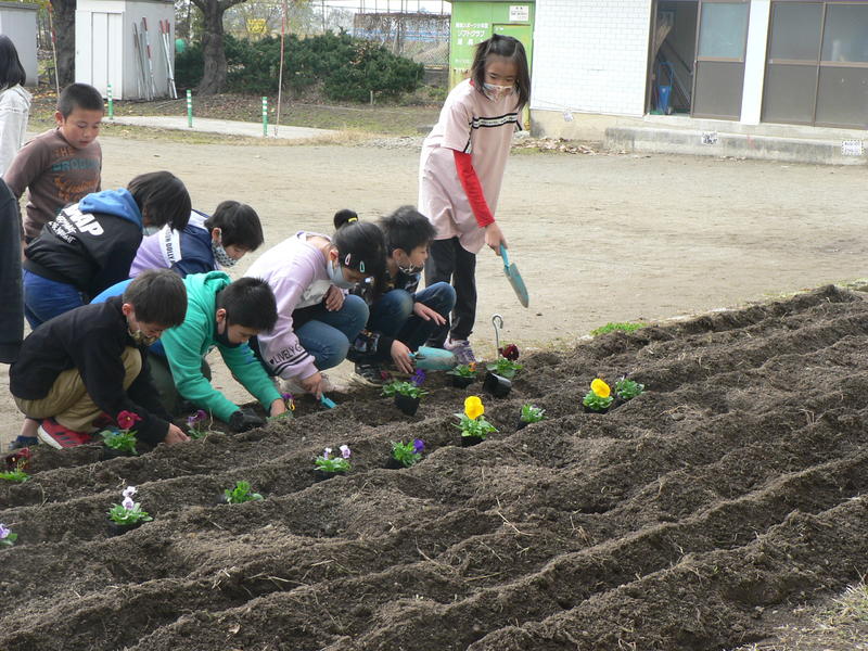 2020年11月18日 12時56分土曜日に保護者の方々にきれいに耕していただいた学級花壇にパンジー・ビオラの苗、そして、チューリップの球根を植えました。6年生が朝の短い時間にきれいに植えてくれた花壇を参考にしながら各学年が植えました。学級花壇も冬に向けての準備が進んでいます。