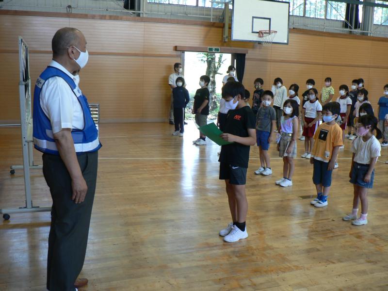 3校時に防犯避難訓練(不審者侵入による避難訓練)を行いました。職員室に不審者が侵入しそうになった状況で児童がいかに安全に体育館へと避難できるかの訓練でした。全校生が避難した後に、講師を務めてくださった喜多方警察署の少年補導員の方とスクールサポーターの方から、不審な人に町で出会ったときの対処法について教えていただきました。もしもの場合に備えての学習の時間でした。お2人の方々、お忙しい中、丁寧に教えてくださってありがとうございました。