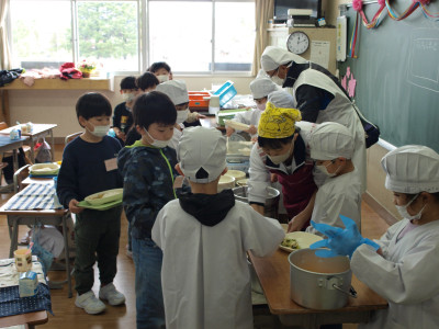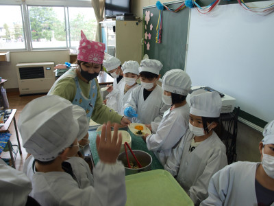今日の給食は、茨城県の郷土料理でした。献立は「ごはん、納豆、煮合い、のっぺい汁、リンゴ」です。「煮合い」は茨城県水戸市の郷土料理で、特産の「ごぼう」わ使った料理です。お正月やお祝いの時などに作られているそうです。「煮合い」には、「酢」が入るので、日持ちする料理になっています。
