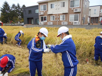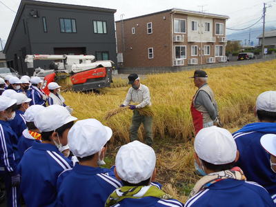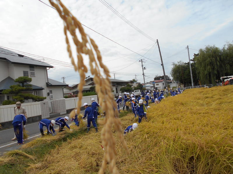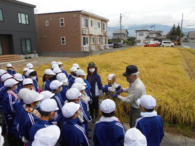 2020年10月7日 11時06分5月に植えた稲もたわわに実り、今日は稲刈り体験です!農業支援員4名の皆様に、稲刈りの方法を教えていただきました。子ども達は、ペアを組み、稲を刈るザクザクという心地よい音を楽しみながら、縛ったり、運んだりと協力して稲刈りに取り組んでいました。本年度も農業支援員の皆様には、稲の他にも、サツマイモ、カボチャ、大豆と様々な農作物についてご指導頂きました。ありがとうございます!