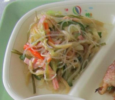 本校からは、5年生の相原さんが考えた「はりはり野菜サラダ」(写真左)が献立となりました。カミカミご飯は、第三小4年生の考えた作品。カミカミ豚肉ロールは、高郷小の先生が考えた作品でした。