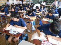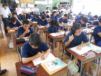 2018年7月11日 17時00分本校で塩川小中連携授業研究会が行われ、町内各小学校から45名の先生方においでいただきました。公開された授業は1年1組が国語で「スピーチ原稿の見直し」を、2組が英語で「Unit4 ホームパーティー」、2年2組が数学で「1次関数の傾き」、高道学級が「牛乳パックから紙を作ろう」でした。小学校でお世話になった先生方に授業を見てもらうということで、子どもたちは張り切って取り組んでいました。