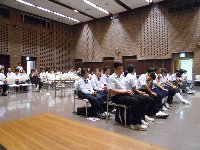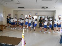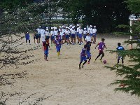 2017年7月27日 17時00分 塩川地区4小学校から70名の6年生が本校を訪れ、「すくよかふれあいの集い」が開催されました。それぞれの学校紹介の後、「会津自然の家」星潔先生指導の下、信頼関係作りゲームを行いリラックスしたところで、生徒会役員が先導し校舎案内と部活動見学が行われました。それぞれ部長が各部活動を紹介し、その後グループに分かれて内と外の部活動の様子を見学していました。中学生のがんばっている姿に、あこがれのまなざしを向けていたようでした。