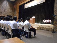 2017年7月20日 16時00分 今日は一学期の終業式がありました。式のあと、各学年代表生徒が一学期の反省を発表しました。いずれも学習や生活、部活動を振り返った上で、しっかりとした発表をしてくれました。続いて生徒会から蒼煌祭(文化祭)テーマの発表がありました。生徒から149の応募があり、その中から実行委員で話し合い「スポットライト~だれもが輝く瞬間を~」に決定したことが発表されると大きな拍手がわき起こり、蒼煌祭に向ける意気込みが感じられました。