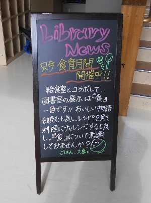 左は5月中旬頃に更新されたものです。右は今週更新されたもので、給食室とのコラボというおもしろい企画が紹介されています。これを描いてくれているのは、本校図書館司書の菊地かおりさんです。より多くの子どもたちが本や新聞に興味を持って図書室に足を運んでくれればとの願いが伝わってきまね。