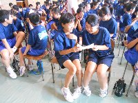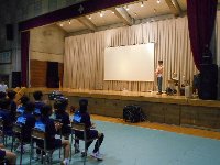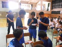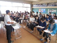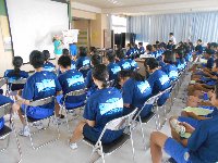 2017年7月10日 17時00分 日中の気温が34℃を越える中、体育館で薬物乱用防止教室を実施しました。まず、養護教諭の佐藤茂子先生から薬物乱用防止に関する基礎知識を教わり、次に渡部泰子先生から、動画を見ながら質問に答える形でその種類や恐ろしさ、巧妙な誘いの手口などについて学びました。さらにロールプレイで誘われたときの断り方を実際にやってみました。