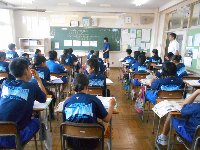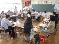 2017年7月12日 17時00分 小中学校の連携を図り、児童生徒の学力向上を目的とした授業研究会が本校で開催されました。各小学校から44名、本校から22名の併せて66名が参加し、1年生4クラスの授業参観を行いました。1組は国語で「ことばをつなぐ」連句を題材にした授業でした。2組は数学で「文字と式」で棒の本数を求める式から、その考えを読み取り説明するというものでした。3組は英語でUnit5自分の知らないものを訪ねる学習でクイズやペア学習に積極的に取り組んでいました。高道学級では「漢字に親しもう」で漢字の部分を組み合わせて漢字をつくる学習でした。